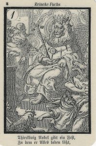 There are eight "quartets," each presenting a phase of Reynard's story. The numbering system assigns a numeral in a circle within the black-and-white image on each page for the quartet—from "1" to "8." Above this, outside the image, is a set of from one to four symbols like asterisks. So each card is unique: the second card, e.g., of the fifth quartet. The backing of each card presents the same set of six fox images in a checkerboard pattern balancing light and shadow. I believe that Herr von Fuchs arranged for the production of these lovely laminated cards himself. I am sorry that my favorite image of the cat attacking the local priest is not here. Perhaps the most graphic of the cards here is the third card of the sixth quartet, in which the severed head of the rabbit is brought forth from the wallet. -