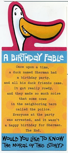 The front side of this card tells a story about a rowdy birthday party among ducks. Cows in a neighboring barn called the police. The front of the card asks "Would youlike to know the moral of this story?" The inside of the card then asks "Or would you rather know how the cow dials the phone?" - Date