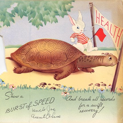 The front reads "Hope you're making steady progress…And break all records for a swift recovery!" As the card is unfolded, the tortoise stretches his neck across the finish line marked "Health." The text on the inside is "Show a burst of speed." A disgruntled rabbit with a flag in his paw looks on. The card is signed twice by "Uncle Joe and Aunt Olive." When you click on this card to see it full-size, be sure to notice the second image showing the expanded version! - Date
