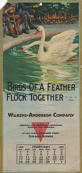 February, 1929 calendar1928? February, 1929 calendar with a maxim from Aesop and a Milo Winter illustration. Advertisement for Wilkens-Anderson Company, Chicago, IL. 4¾" x 10". St. Paul, MN, and Sault Ste. Marie, Ontario: Brown & Bigelow. $7 from Sandyscottage through Ebay, Jan., '25. I am particularly happy to add this calendar to the collection since it repeats one already in the collection as February for the year before! The conclusion seems to be that Brown & Bigelow had designs ready to go that were not tied to a specific year. Fascinating! As is true generally for the Brown & Bigelow series, it is not clear, to me at least, which fable is presented or alluded to here.
