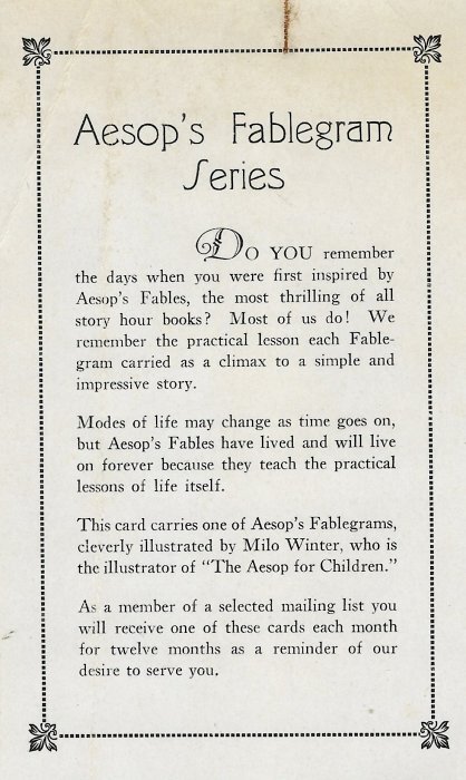 (Aesop's) Fablegram Series1929 (Aesop's) Fablegram Series. Twelve monthly calendars for 1930 featuring maxims and Milo Winter illustrations. 4¾" x 10". St. Paul, MN, and Sault Ste. Marie, Ontario: Brown & Bigelow. $100 from bisboutique on Ebay, May, '24. These are colorful presentations of animal scenes with aphorisms drawn from or like those of Aesop. The illustrations are true Milo Winter, often quite cute and often presenting a fable in different characters and circumstances from the usual. Brown and Bigelow styles themselves as "Specialists in Direct Mail Advertising." Aesop is acknowledged in this set only on the introduction card. One wonders if the card belonged to a different series. Might there have been a first series of Aesop's Fablegrams that was followed by a series of "clever animal scenes with pithy sayings."