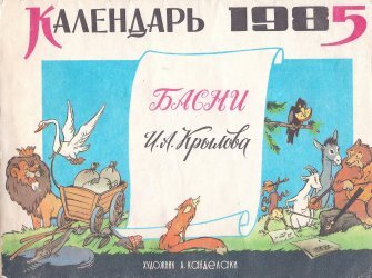 Kalendar 1985: Basni I.A. Krylov1985 Kalendar 1985: Basni I.A. Krylov. Artist: A. Kandelaki. Tibilisi, Georgia, USSR. Ordena Trudovogo Kroasnogo Znamoni Tipografiia Izdatel'stvo: Typographic Press of the Order of the Red Banner of Labor of the Central Committee of the Communist Party of Georgia. $10 from Valentina Kudinova, Kharkiv, Ukraine, Nov., '12. For an ephemeral item, this is a beauty! It is actually a rather spare stapled pamphlet 11"x 8¼" with only one page to add to its twelve foldout spreads. The upper page of each foldout is a delightful multi-colored illustration of a Krylov fable. Virtually every one is identifiable, and many of them are prefigured on the cover: FC; "Quartet"; LM; and "The Swan, the Pike, and the Lobster." The others include "The Elephant and the Pug"; WC; "The Pig and the Crow"; FG; "The Cook and the Cat"; and GA. Two that I cannot recognize picture an older and a younger mouse for February and two dogs for April. The grasshopper in GA has a purse, fashionable hat and necklace, a parasol, and long eyelashes.