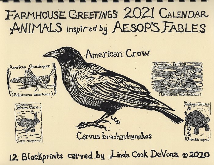 Farmhouse Greetings 2021 Calendar2020 Farmhouse Greetings 2021 Calendar: Animals Inspired by Aesop’s Fables. 8½” x 11”. Twelve blockprints created by Linda Cook DeVona. $12 from Farmhouse Greetings through Etsy, Dec., ’20. This set of blockprints lives up to its billing: blockprint is the perfect form and style for this kind of calendar. Except for January’s picturing of both the Galapagos Tortoise (Chelonoidis nigra) and the Brown Hare (Lepus europaeus) and May’s FS (Vulpes vulpes and Ciconia ciconia), each month presents one animal with its Latin title. One last exception is September, which offers a rat and an elephant in what I suspect is a variation of LM. The back of the calendar includes a link to one of the online versions of the texts behind these illustrations. Linda sent along a smaller one-page flier featuring TH and the whole calendar. I will also picture it here.