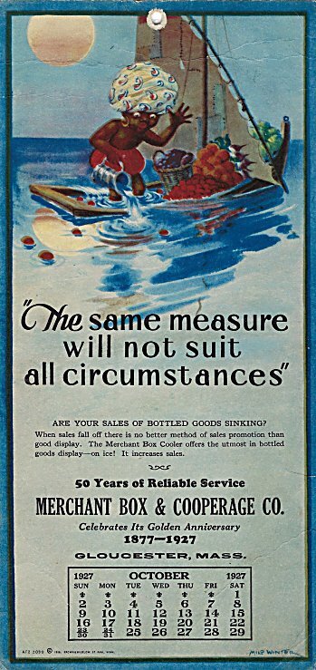 Merchant Box and Cooperage Company of Gloucester, MA1927 Merchant Box and Cooperage Company of Gloucester, MA. Brown and Bigelow calendar for October, 1927 with illustration by Milo Winter. $16.99 from The Jumping Frog through Ebay, Jan., '25. The formatting and approach of this blotter is remarkably similar -- and by the same artist -- as our various calendars designed by Winter and printed by Brown and Bigelow. The design has a boat operator emptying water out of his boat. After the highlighted maxim, the calendar asks "Are your sales of bottled goods sinking?" I have trouble identifying a known image or story.