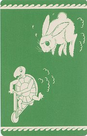 Two matching decks of TH playing cards1940? Two matching decks of TH playing cards. The design shows white characters against a green and a black background, respectively. Self sorting club playing cards. "Deck Copr. 1932." In the sturdy original 3 7/8" x 5" box. NY: Bid-Rite Playing Card Corp. $12.99 from Louie and Annette Fotinatos, Norwalk, CA, through Ebay, March, '01. The card that comes along with the deck proclaims "Self-Sorting Cards—First Change in over Three hundred years." Wow! I received these cards with the original cellophane still around each deck. Each deck also still has its original inspection notice. In the design the tortoise on a scooter moves to the bottom left corner of the card, while a hare (in mid-air?) bounds after him.