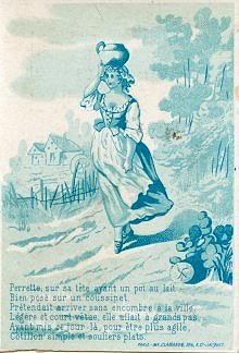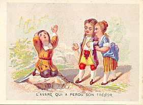 Clamaron Blue MM1890? 5 cards beginning a set presenting La Fontaine's MM. The cards follow the fable's text up to a natural break preceding a reflection ("Do not all of us daydream?") by La Fontaine. Perhaps there is another card or two in the series. Paris: Imp. Clamaron, Rue St. Jacques. $20 for the five from Bertrand Cocq, Calonne-Ricouart, France, Nov., '00. Extra copy, cropped, of Card 3 for 40 Francs from Annick Tilly, Clignancourt, August, '99.
