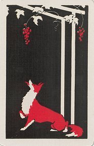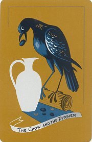 Two decks of playing cards showing FG and CP1950? Two decks of playing cards showing FG and CP, respectively, on their backs. The fox is as above in the three-deck Canasta set. For CP, against a tan background, a black crow stands over a white pitcher. A banner in white and blue-gray proclaims the title underneath the scene. In the sturdy original 3¾" 5" slipcase. Cel-U-Tone Finish. Congress Playing Cards. $6 from Harry Glogower, New York, NY, through Ebay, June, '00. The style and artistry of the two cards make them a nice complement to each other. I am especially pleased that someone had sense enough to put two fables together in one set.