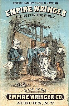 Empire Wringer Company1915? I have found two colored cards advertising the Empire Wringer Company. The first pictures a ram marrying two foxes in a small gathering of animals. The second pictures mother and father fox with their baby fox in a kind of bassinet. The first card comes from an unknown source and the second from William Phillips of Lewiston, ME, through eBay, Jan., '03. Is there a fable behind these illustrations? Is it perhaps from Renard? If so, would people have recognized it without any kind of a title? Of course it is hard to know anyway what a fox marriage has to do with washer wringers! The Empire Wringer Company was in Auburn, NY. Their "Empire"model, pictured on the verso of both cards, was available from A. Page in Wentworth, NH for the first card and from M.B. Potttle of Kingfield, ME, for the second card.