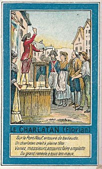 Ch. Duffit and Dr. Guillié1900? Five colored trade cards printed by Ch. Duffit. 2½" x 4". 2 from an unknown source. 3 further cards for $18 from Bertrand Cocq, Calonne Ricouart, France, Sept., '20. Seven further cards presented as "Bon Point" cards advertising DeGuillié Tonic Elixir. €6 each from cpcr958 on Ebay, Sept., '21. The two cards depict "Les deux Mulets" and "Le Loup devenu Berger." Each card is titled "Fables de La Fontaine." Each at the bottom has the title of its fable and the moral. One advertises Francetta chocolate. Another advertises "Chauss? Paul." This firm seems to sell "specialités pour Pieds sensibles" and is a "Maison de Confiance." The three from Bertrand in 2020 bear no advertising. All but one of the cpcr958 cards are stamped on the verso with "Nouveaux Prix" and the new and higher prices. I wonder how big this series of cards is….