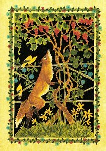 The Fox and the Grapes note card1990? The Fox and the Grapes: An Aesop Fable. A Scherenschnitte design cut from a single sheet of paper and painted in water colors by Claudia Hopf. Five cards boxed, with envelopes. Beverly, MA: American Folklore: Kristin Elliott Inc. Gift of Margaret Carlson Lytton, from the Amy Aldrich Rockefeller Folk Art Museum in Williamsburg, 1994.
