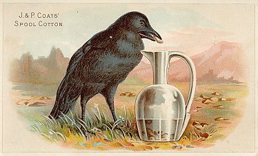 J & P Coats Thread1885? 8 colored cards (apparently from a series of 8) used for J. & P. Coats Spool Cotton (unnumbered, with advertising and the fable text in various formats on the back), McPhail Pianos (each marked with the same simple number "32" and only the fable text on the back), Emerson Pianos, Eureka-Maryland Assurance and other advertisers (with various numbers introduced by "No."). Some also appear blank. 3" x 5". Multiple copies of each card, and reverses of three, as seen below. Between $3 and $12.50 from various dealers. There is an advertising booklet for Wright's Indian Vegetable Pill Company that uses seven of these eight fables and their illustrations, excluding only CP. Curiously, I purchased a set of seven "J.P. Coats" cards from Sherry Sonnett, Los Angeles, in May, '11, and CP is again the one missing card.