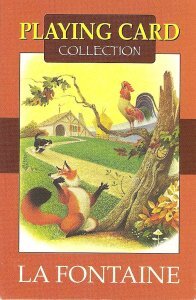 La Fontaine Playing Card Collection2004 La Fontaine Playing Card Collection. Art by Dante Moglisi. Turin: Lo Scarabeo. €10 at Variantes, Paris, Dec., '04. Two extra copies. "54 cards dedicated to some of the most famous tales." The 54 full-color illustrations here are small but delightful. Variantes was a store I came to love for its various puzzles and games. These cards were a great find on my way to Africa, when I wisely took an overnight in Paris along the way.Click on a card to see a larger version of it.