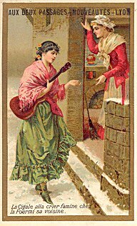 Aux Deux Passages1895? 2 full-color cards illustrating La Fontaine's GA with human figures as actors. Just over 2 ½" by 4 1/8". Both backs are blank. 80 Francs each from Annick Tilly, Clignancourt, August, '01. The texts do not follow La Fontaine exactly. This is the first time, I believe, that I have seen the ant dance in any form. The "Aux Deux Passages" is in Lyon and sells "nouveautés." Though I presume that there are six or seven cards in the set, these two complement each other nicely. In the first scene, the cicada approaches the ant; in the second scene, the ant dismisses the cicada. The artist here works with a very traditional approach to the fable: young woman visits matron. I find the artistry very good. The folds of the "cicada" skirt in the first picture, and the vigor of the dance (and the rejection) is telling in the second. Now, in late 2008, I discover that these two pictures are identical with the last two in Liebig's 1892 "Grille und Ameise" series. My comments turned out to be right on the mark, and the dating seems quite close too!
