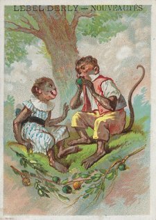 Depot Centrale1895? Nine full-color cards illustrating La Fontaine's fables in landscape format with children as actors. The backs of eight, uniform in format but not content, all refer to "Dépot Central, 41, Rue Richer, à Paris." $50 from Bertrand Cocq, Calonne, Ricouart, France, March, '01. None of the pictures on these cards is well coordinated for colors. Perhaps the best of the colored images is the bespectacled child playing the teacher in "L'Enfant & le Maitre d' École." The most curious feature of this set lies in the unusual relationship between picture side and verso. The latter seems to go its own way, to have a series of scenes of its own, independent of the picture-side. The cards on this reverse side offer six different numbered black-and-white scenes (with doubles of #1 and #4) advertising Alcool de menthe de Ricqlès. In each, one character recommends to another the virtues of this product. This product also produces white teeth and good breath for young women, according to #1. Perhaps she is getting ready to meet her fiancé, who in #5 is also taking some to get ready for her. In #2 it will revive a woman who has fainted. In #3 it is the ideal substitute in the café for the dangerous absynthe. Maybe the most persuasive is #4, where the issue is sea-sickness. In #6 a traveller gets a recommendation on a guide-book, but an even stronger recommendation for Ricqlès as the cure for every least sickness. Two of the cards use people to fill animals' roles: " Le Chat, la Belette & le petit Lapin" and "Le Loup, la Chèvre & le Chevreau." MSA seems to put the fable into the background of the picture. For other cards using the same images, see Bouillon-Rivoyre et Cie Children.