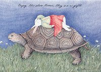 The Tortoise and the Hare Greeting Card1990 Landscape colored painting greeting card. The front shows a dressed female hare riding supine and perhaps asleep on a large tortoise. Above them is written "Enjoy the slow times, they are a gift." Blank inside. Paris Bottman. Lithographed in USA. Salt Lake City, UT: Bottman Design 125 30132. Gift, '94. Even if it is a run-on sentence with a comma splice, it is a wonderful sentiment! The languid posture of the hare is perfect for this scene and message.