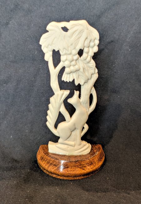 Ivory carved Fox and Grapes1970? Bas-relief of FG carved from bone. Albania. Modeli 8. Scene 3.5” high. Whole piece 4” high. Unknown source. Was this someone’s souvenir from some foreign travel? The cut marks on the back suggest that the material was chiseled rather than poured. The Albania label is surprising. The scene itself shows fine work, especially in dealing with the grapes, leaves, and vines. A quick search on the web reveals many similar carvings.