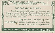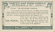 Gallaher 1931 Series of 501931 Aesop's Fables. Gallaher Ltd. So called "Series of 50." $9.95 from "Warlock" through Ebay, Nov., '01. Having heard that there was a so-called "Series of 50" that had only 25 cards in it, I was on the alert for it and at last found it. The design is exactly the same as in the series of 25 done by Gallaher, apparently in the same year. Had they planned to go further but never perhaps got around to it? A number of cards in this particular set are misprinted on the verso, so that they show a part of a column from a different card and miss part of this card's column. Might these be contemporary reproductions?