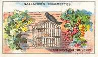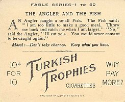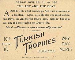 Fable Series--51 to 1001913 Fable Series--51 to 100. A.T.C. Turkish Trophies Cigarettes. I have 49 of the 50 cards in the set. Most cards marked by the factory from which they were distributed, e.g. Factory No 7, 3rd Dist., State N.Y. 44 of the cards for £64.90 from Murray Cards International, Cecil Court, London, August, '97. Other cards through Ebay from Don Anthony, Phoenix, OR; Mary Brush, Colby, KS; Darrell Dirr, Middletown, NY; Ron and Kathleen Hamill, Wakefield, RI; Josh Harris, Novato, CA; Andrea Howell, Bangor, PA; Glenn W. Kennedy, Flagler Beach, FL; Bill Miller, Fort Collins, CO; Teresa Poole, Springfield, MO; and Chris Stetzer, Red Lion, PA. Delightful colored pictures and simple, straightforward tellings. Like Murray, I arrange them alphabetically. I find no way to identify a number on the cards themselves. About 2¾" x 3 1/8". Though it may be disguised here through clever cropping, most of these cards have bumped corners. In this set, there are several cards in fair and even poor condition. For this set, I have had to work hard on Ebay to find cards not available from Murray and to improve on some in the Murray set that were of lesser quality. For a long time, I have been missing one card: "The Lark and Her Young." I finally found it on eBay for $20 in Oct., '02. Among some pleasing art, my prizes for visual effect here go to "The Eagle and the Jackdaw," "The Goatherd and the Goat," "The Monkey and the Camel," "The Quack Frog," and "The Wolf and the Shepherds."