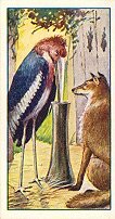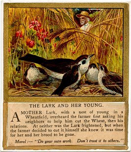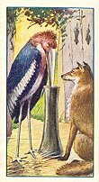 Fable Series--1 to 501913 Fable Series--1 to 50. A.T.C. Turkish Trophies Cigarettes. Most cards marked by the factory from which they were distributed, e.g. Factory No 7, 3rd Dist., State N.Y. £82.50 for a full set from Murray Cards International, Cecil Court, London, August, '97. Other cards through Ebay from Don Anthony, Phoenix, OR; Ron and Kathleen Hamill, Wakefield, RI; Josh Harris, Novato, CA; Andrea Howell, Bangor, PA; Glenn W. Kennedy, Flagler Beach, FL; Bill Miller, Fort Collins, CO; Teresa Poole, Springfield, MO; and Chris Stetzer, Red Lion, PA. Delightful colored pictures and simple, straightforward tellings. With Murray, I arrange them alphabetically. I find no way to identify a number on the cards themselves. About 2¾" x 3 1/8". Though it may be disguised here through clever cropping, most of these cards have bumped corners. Among some pleasing art, my prizes for visual effect go to "The Blind Man and the Whelp," "The Fox and the Woodman," "The Mice in Council," and "The Peacock and the Crane."