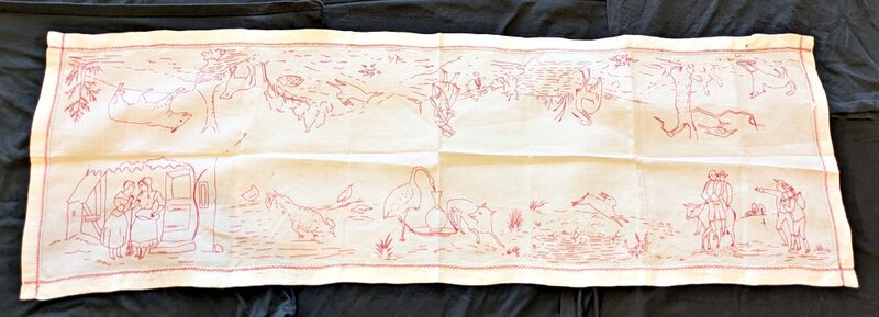 Red and white fable Table Runner1980? Red and white runner featuring ten fable scenes. 44.5" x 14.5”. Source unknown. This piece of cloth features two rows of distinctive fable scenes. One row features, from left to right, FC; "The Heron"; MM; TH; and WL. If we turn it over and again proceed from left to right, we have "The Secret"; CJ; FS; "The Hare and the Frogs"; and MSA. Some scenes are more skillfully rendered than others, but overall it is a lovely piece!