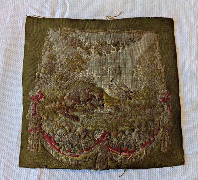 FS Canvas Tapestry1850? FS Canvas Tapestry. Presumably made in Aubusson, France. 17” x 16.5”. Source unknown. This well-worn piece still has a recognizable scene, with the fox lapping up his thin soup while the frustrated stork looks on, perhaps already planning some payback. Would a piece like this have covered a chair or pillow? Is it, as I believe, deeply worn?