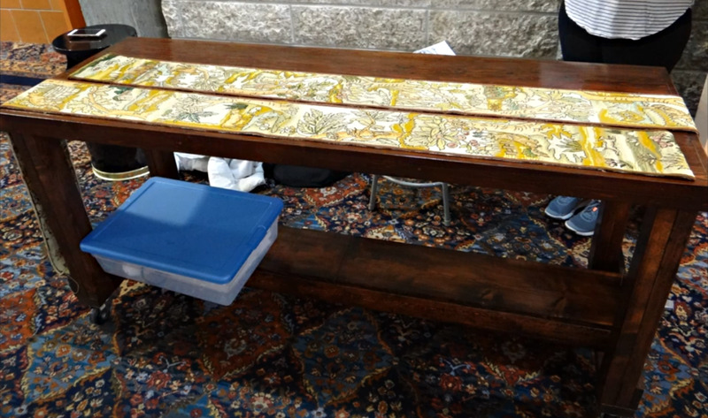 Two matching tapestries of fables of La Fontaine1900? Two matching tapestries of fables of La Fontaine. 8” x 8’. Unknown source. Each of these long, slender, exquisite tapestries contains six fable scenes. The style is similar to that on our wider tapestry, but strangely none of the twelve scenes presented here are the same as the seven there. Two of the images here are unclear to me. I would love to have help in deciphering them! The first image here shows them as they stood at the entrance to an on-campus exhibit of the fable collection, "Thundering Tortoises and Horrified Hares," in January, '18.