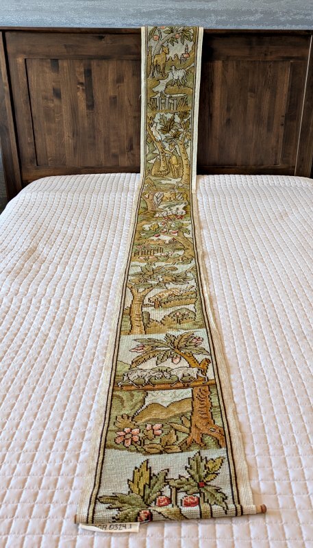 Single tapestry of fables of La Fontaine1900? Single tapestry of fables of La Fontaine. 8” x 8.5’. Total width 10”. Unknown source. As in the matching pair of tapestries, this long, slender, exquisite tapestry contains six fable scenes. In order, they are WL; “The Fox and the Cat”; “The Hare and the Frogs”; TH; DS; and “Two Goats.” These are the same six subjects – and the same six images – as on Tapestry B above, but in different order. And the canvas backing of the tapestry remains at the sides of this tapestry. It is again noteworthy that none of these subjects or images occur on the broader single tapestry above.