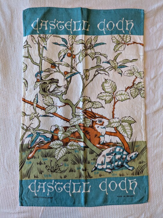 TH Castell Coch Linen Tea Towel2000? TH Castell Coch Linen Tea Towel. 55% linen, 45% cotton. Made in Ireland. 17.3” x 13.5”. Source unknown. As the web tells us, the design is inspired by the wall paintings in the octagonal drawing room of Castell Coch, a Victorian Gothic Revival castle in Wales. Perhaps the most fascinating feature of this colorful presentation, based on murals at Castell Coch, is the frog perched above the race with a bottle in his hand. At first I thought he might have bet on the wrong racer. After viewing more of the Castell Coch wallpaper, I believe that he is the quack doctor who promises to heal others, even though he cannot heal himself.