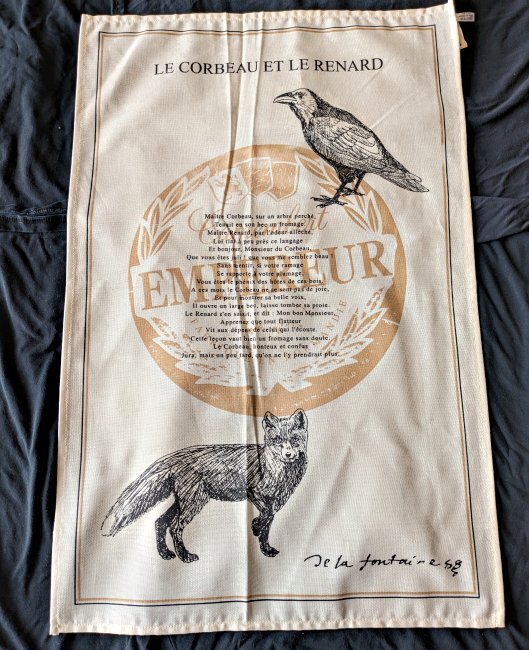 Four Matching Cloths of La Fontaine’s Fables2000? Four matching cloths of La Fontaine’s Fables from le Musèe de la Fontaine. OF; “The Heron”; TH; and FC. Pure cotton. 18.5” x 28”. Le Musèe de la Fontaine. Distributed by Tradilinge. Unknown source. These four cloths offer texts in black, central figures in black, and brown background in a very pleasing combination. What are these cloths meant to do, other than to represent La Fontaine’s fable beautifully? I learned from investigating these cloths that L'Empereur is a soft, washed rind cheese made with pasteurized cow's milk.