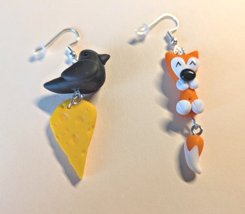 Fox and Crow with Cheese Earrings2000? Fox and Crow with Cheese Earrings. More fun in a pair of earrings! For me, the fox’s curved tail is especially successful!