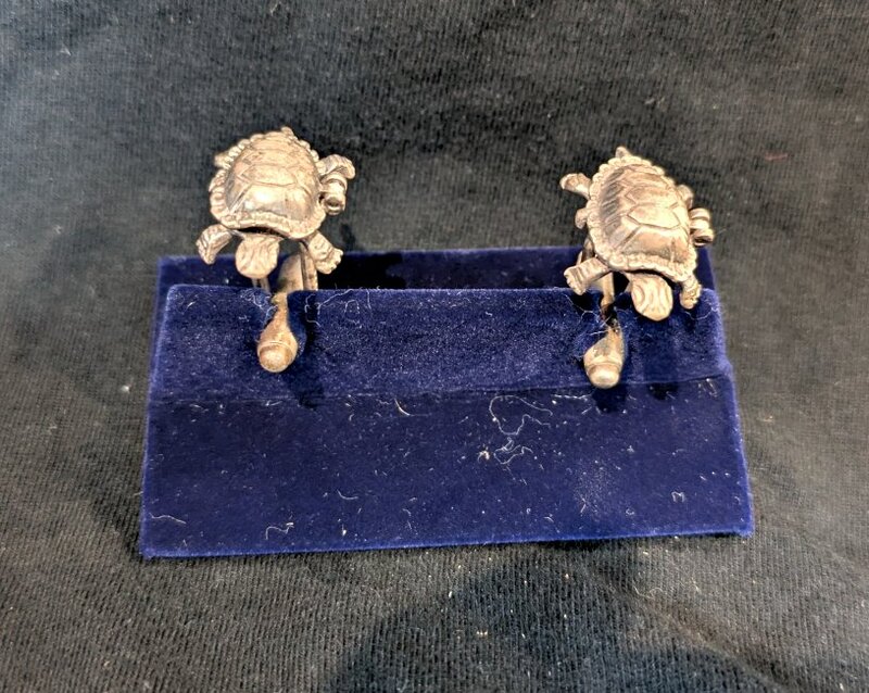 Tortoise and Hare Cufflinks1900? Cufflinks of a tortoise whose shell opens to reveal a hare. Made in England? Hallmarket Silver? Source unknown. This is some of the most delicate small work in the collection! Each cufflink has a hinged tortoise back. Opening it with clumsy fingers is not easy! Does the Hallmarket Silver box belong to this exquisite pair? And what brings a person to wear openable tortoise-and-hare cufflinks? Matched tortoise cuffliniks seem common enough on the web. I have not yet found TH cufflinks.