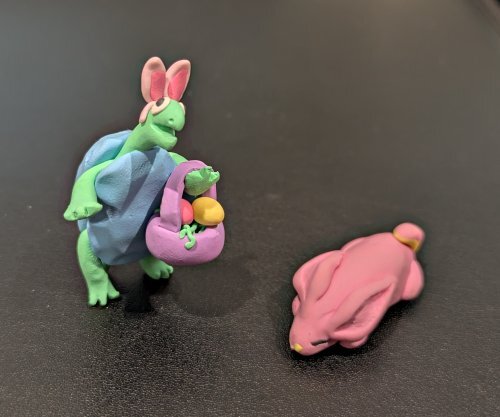 TH Clay Charms2000? TH Clay Charms. 1.5". Unknown source. Beautifully formed charms. The tortoise is particularly intricate with a springtime basket. While the hare has holes at his mouth and tail, the tortoise has holes in his shoulders.