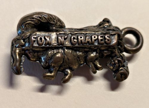 Plastic FG charm with inscription “Fox N’ Grapes.”1940? Plastic FG charm with inscription “Fox N’ Grapes.” 1" x .5" outside of the ring. This looks like a cracker jack “toy” or gumball vending prize. Unfortunately, the web offers no help on finding a series to which this might belong. The name on one face tends to obliterate the scene. The other face helps us to see the fox and the grapes. Since the inscription is written at 90 degrees from the scene itself, I offer three different views.