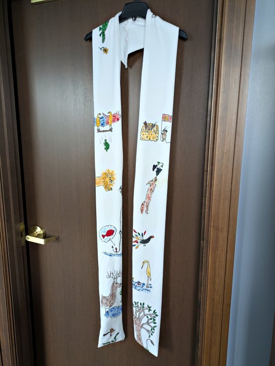 Fable Stole1993 Stole Featuring Fable Scenes. Eric Heinzen, student in CLC 325 at Creighton University. Eric brought together two dear facets of my life: priestly ministry and fables. Among the fables recalled here are TH; TT; LM; “Three Fish”; “Stag at the Pool”; “Retired Rat”; FG; BF; “Heron”; and OR. I offer two close-ups from a treasured creation.