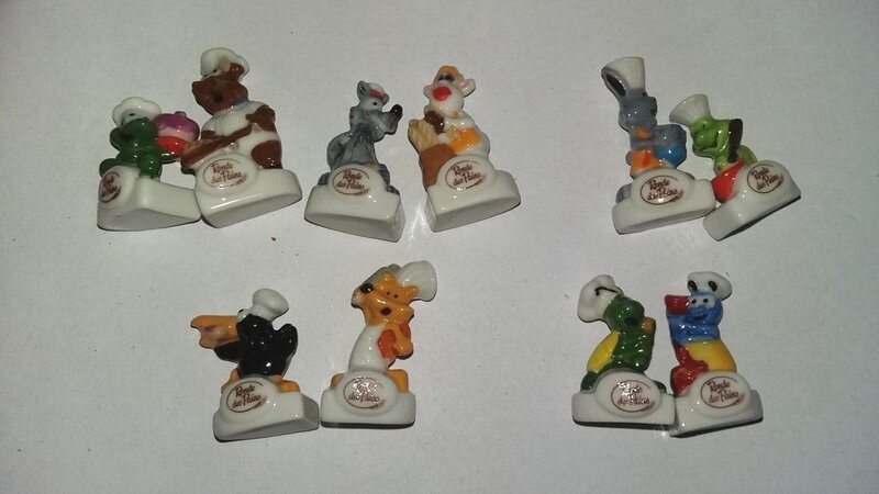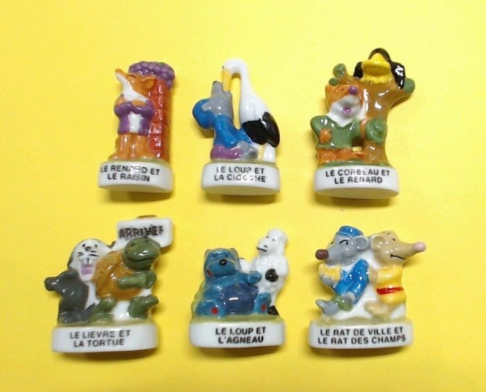 Feves of Two Characters with Some Lower Case Titles1980 12 different fables illustrated by fèves. From various vendors online and at French flea markets, through August, '15. These "beans" combine two characters in one scene, often with simple and even garish coloring. Simple forms. Are these members of more than one set?