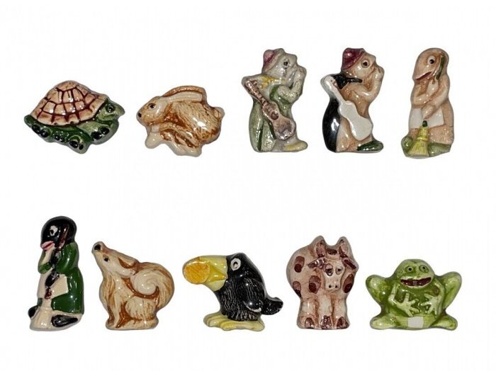 Set of Ten Two-Dimensional Fèves2000? Série complète de 10 fèves Fables de la Fontaine. Two dimensional. €17.81 from fabolfolies through Ebay, Oct., '22. The unusual characteristic of this otherwise unidentified set of 10 fèves is that each has a flat side and is thus two-dimensional. It is also unusual that two pairs out of the ten figurines use the same form but are colored differently. Is there a black ant and a white ant? And are there two cicadas? Otherwise we have OF, TH, and FC.