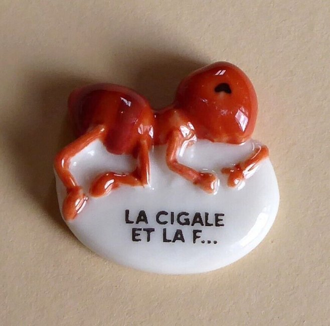 Grasshopper and Ant feve disk2018 Feve disk "La Cigale et la F…." €1.40 from Un monde de collection through Ebay, Dec., '23. This disk is clearly to be paired with a fellow representing the cicada. Ebay represents it as a "Devinette," which I take to be a puzzle. I presume that description rests on the this feve's need to be paired with its partner.