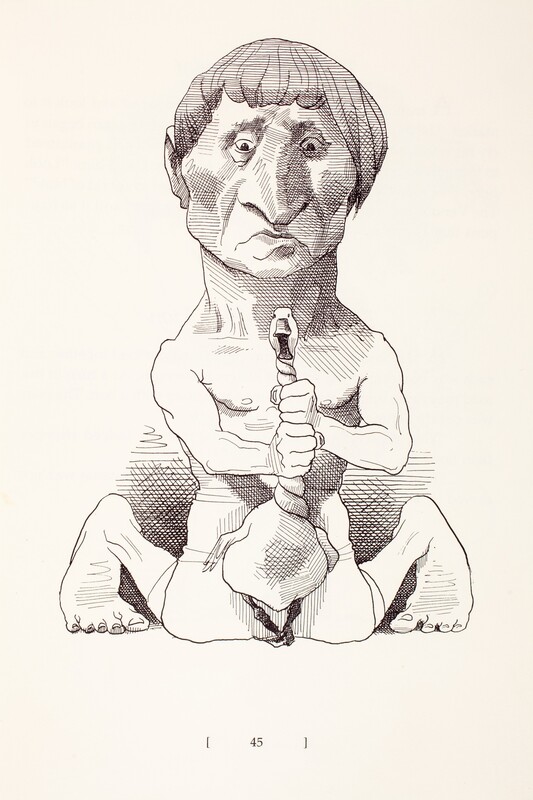 David Levine's The Fables of Aesop in 1975, with texts by Justina and Patrick Gregory, offered the other first stimulus. This book showeve me a visual artist having fun with story after story. Who could see Levine's image and not laugh at the idiot silly enought to kill the goose who had been laying golden eggs? Levine was the longtime caricaturist for the New York Review of Books. His fifty illustrations int his volume reveal someone taking genuine delight in the fables. If a person does not have fun reading this book, there is something wrong!