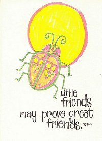 Greeting Card1988? "little friends may prove great friends. Aesop." 4½" x 6". The Printery House. Conception, MO: Conception Abbey. Gift of Mary Pat Ryan, Nov., '92. Though the saying might be most easily matched with LM, the image on the front of the card is that of a psychedelic insect. Might the image and saying both be taken from the fable of the hare, the eagle, and the dung beetle? There is no message inside the card.