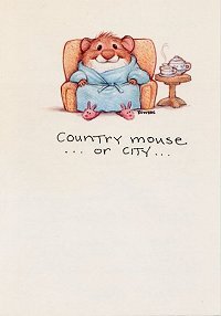 Town Mouse and Country Mouse Get Well Card1991? Portrait-formatted colored painting get-well card. The front shows a mouse in a robe, with slippers on its feet and a steaming pot of tea at its side. "Country mouse…or city…" reads the outside caption, to be finished inside with "Happy Healing!" Ambassador: Hallmark 135ZF 323R. Gift of Vera Ruotolo, July, '92. I would never have thought that Aesopic fables would appear in the world of get-well-cards, but here one is!