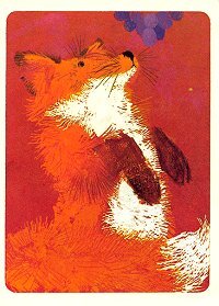 The Fox and the Grapes Greeting Card1985? "The Fox and the Grapes." 5" x 7". Colorado Springs, Co. Gift, '85?. An eager fox assumes a posture like that of a begging dog just before some grapes hanging very near, so its seems, his nose. There is no message inside the card.