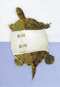Tortoise and Hare Get Well Card2000? Hallmark get-well card. Cover shows a bandaged turtle. Inside: "It's not the speed that matters. It's the getting there. Hope you feel better soon." Gift of Pauli Ruotolo, July, '05. A clever card like this does not even have to repeat "Slow and steady wins the race." We all know the idea, and the sight of the turtle calls it up quickly. As ever, Hallmark is clever.