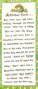 "A Birthday Fable."2002? Birthday greeting card "A Birthday Fable." 8¾" x 4". Made in U.S.A. Kansas City, MO: Expressions from Hallmark. $1 from Sheryl Weilgosh, Oklahoma City, OK, through eBay, Jan., '04. Here is a card meant to supply a surprising answer. Click on this small version first to find the larger version. Then click on the card to open it.