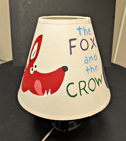 Fox and Crow Lampshade2012? FC lamp shade. Student work. The combination of fable and object has surprised me more than once in collecting some 8000 objects illustrating fables. Here is one of the surprises. I am hoping that this student remembers FC particularly. That was the goal of the exercise!