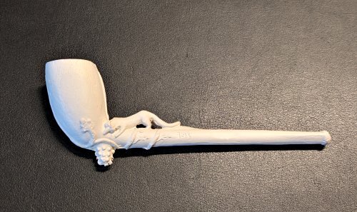 Clay pipe featuring FG1990? Clay pipe featuring FG. 5". Unknown source. The fox seeks the grapes right at the joint of the stem with the bowl. In an unusual turn, the fox here needs to go down to get the grapes. This pipe is fragile. It has already been broken once.