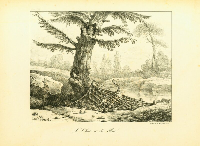 Carle Vernet Lithographs1818? 35 Lithographs by LeComte, Vernet, Engelmann and Mauraisse from about 1817 through 1820. Mostare 14½" x 10½". $80 from jordanb2011 through Ebay, Jan., '21. Engelmann seems to be the engraver for many of these. I have assigned him authorship for those not signed by LeComte or Vernet. These seem to be pages from a book in our collection, "Fables choisies De La Fontaine ornees de figures lithographiques" from 1818, published by Engelmann.