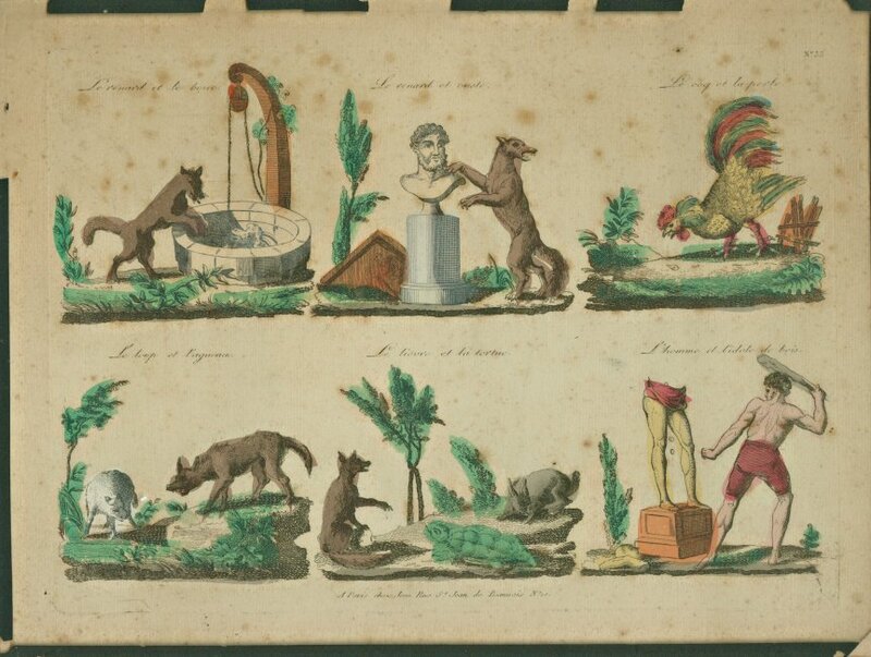 Chez Jean Rue St. Jean de Beauvais No. 101800? Framed colored lithography of six fable scenes. #33. Dimensions. Paris: Chez Jean Rue St. Jean de Beauvais No. 10. Source unknown. Framed by the Cousin Brothers in Paris with tape, glass, and a backing. The coloration may be typical of such broadsheet production. It does not adhere closely to the definition of figures. Notice in particular how green is applied to the ever-present foliage. The web has works done by Jean at this address dated to 1810. No. 33 of what?