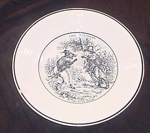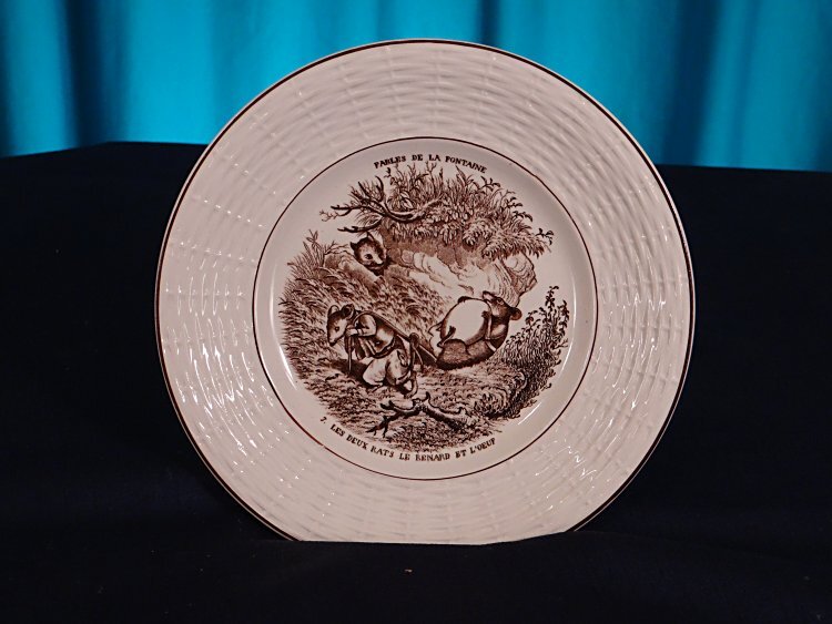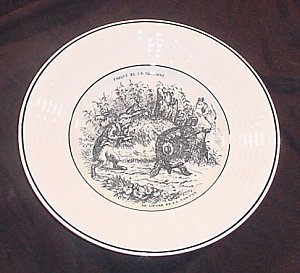 1980? Four plates 7½" in diameter, each presenting a full-color humorous scene from a La Fontaine fable: GA, FC, FS, and WL. On the back of each is "Sarreguemines, France" with "D.V." superimposed. $35 from Larry Roberts, Pasadena, CA, May, '01.Click on any image to see a larger view.