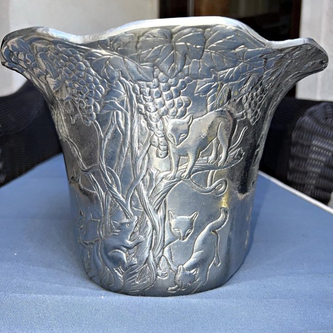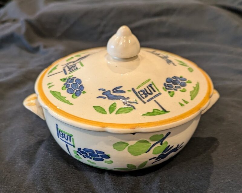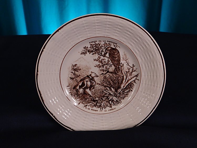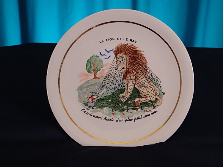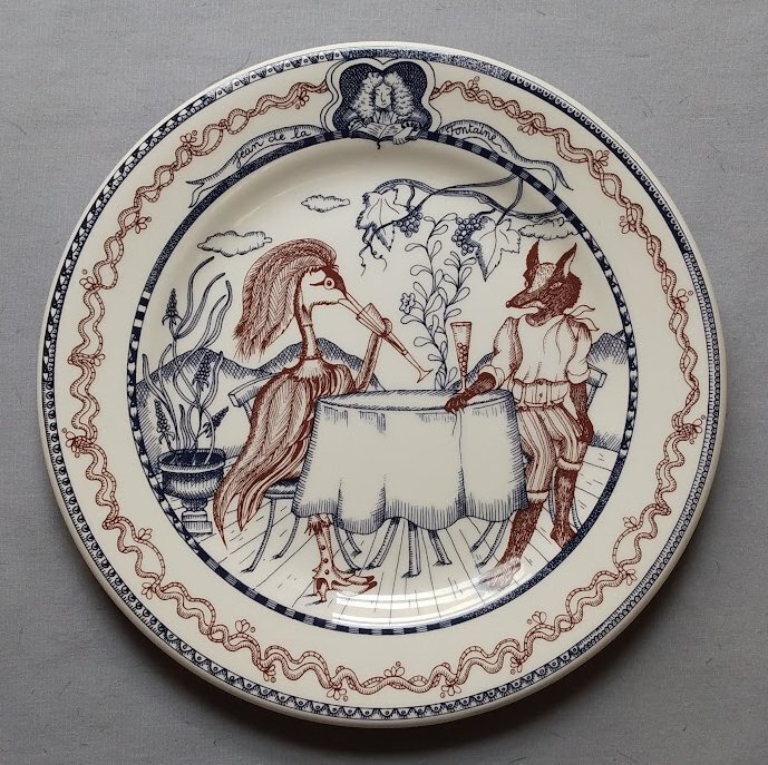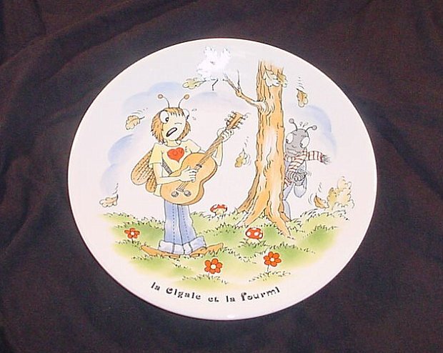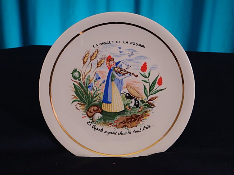 1965? Keller & Guerin, Lunéville, France have a set of six plates illustrating La Fontaine fables. Each is signed "Grotti." $33 for TH and LM from Tori Owen, Ross, CA, through Ebay, February, '01. $49.99 for three from Charlotte Dailey, Texarkana, TX, through eBay, August, '11. Further plates from J. Oliva, Tarzana, CA. I now have all six and extras of LM, WL, and GA. The second copy of GA was broken in shipping. And also now a orridge bowl with cork bird illustrating TH. Signed again by Grotti. P.F.C.: Porcelaine de France. €14.95 from maconlection through Ebay, Jan., ’21.