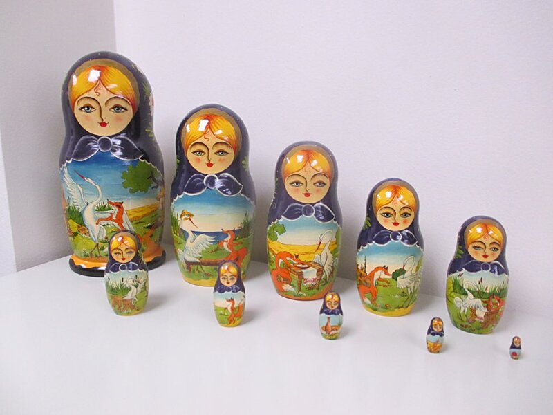 Russian Matryoshka Set of 10, 19931993 Russian matryoshka set of 10 dolls representing FS. $75 from josephcustomcues through eBay, Dec., ' This remarkable matryoshka, signed "Surko L"on the bottom of the largest doll, by the artist, is, according to the Ebay seller, an "authentic hand painted Russian Nesting Doll" originally purchased for $900. As the seller claims, the colors are indeed vivid. 11" tall. The diminishing dolls tell the story of FS, which is beloved as a folktale among Russians. All that is left after the the unfortunate tit-for-tat encounter is an empty soup bowl and an empty vase. Though the display below allows us to follow the story, viewers are reminded that each successive doll is about an inch shorter than the preceding doll. Click on any doll to see a full-screen image.